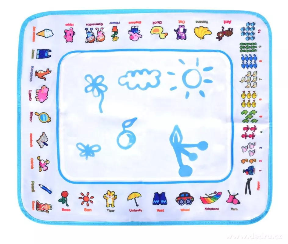 Vodní kreslící podložka + 1 vodní tužka, v zadní části dvě poutka pro možné zavěšení na zeď. Rozměry 57 x 48 cm. Kreslící vodní podložka podporuje přesnost a kreativitu a může pozitivně ovlivnit koncentraci dítěte a motorickou koordinaci.